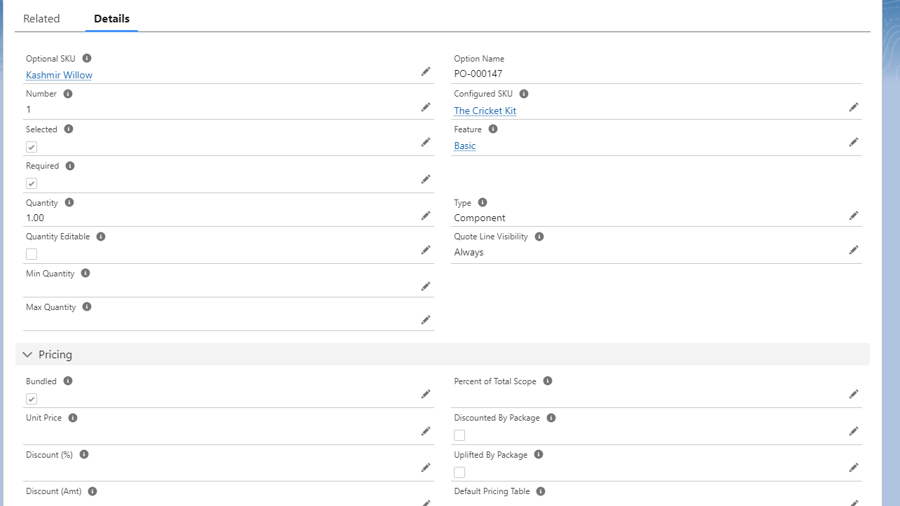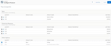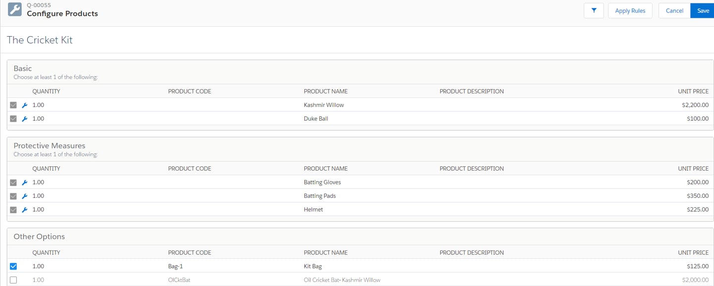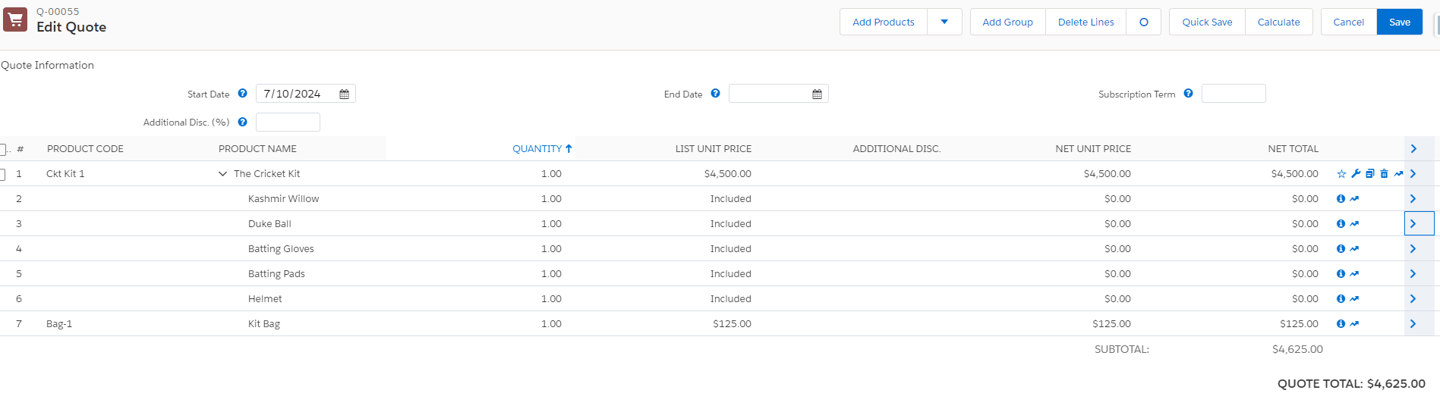 The CPQ package uses standard products with price books and several related custom objects part of the installed application. Since a bundle includes multiple products in it, the individual products have to be set up first in Salesforce ( with their own prices too so that they can be sold independently as well). Let us take a simple example of selling a Cricket Kit as a bundle. A kit contains a bat, gloves and pads, a cricket ball and a few additional products which could be offered separate discounts. A sample QLE looks like this for a very basic kit: