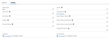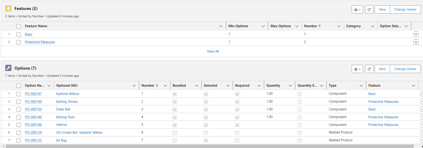 The first step towards such a bundle is to create all the seven products separately in Salesforce and then the final bundle product called Cricket Kit. Once these are set up, the individual lines should get attached to the bundle under separate features. From the parent bundle ( Cricket Kit), go to the related list and click on New under Features: